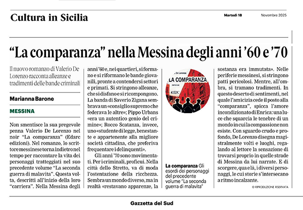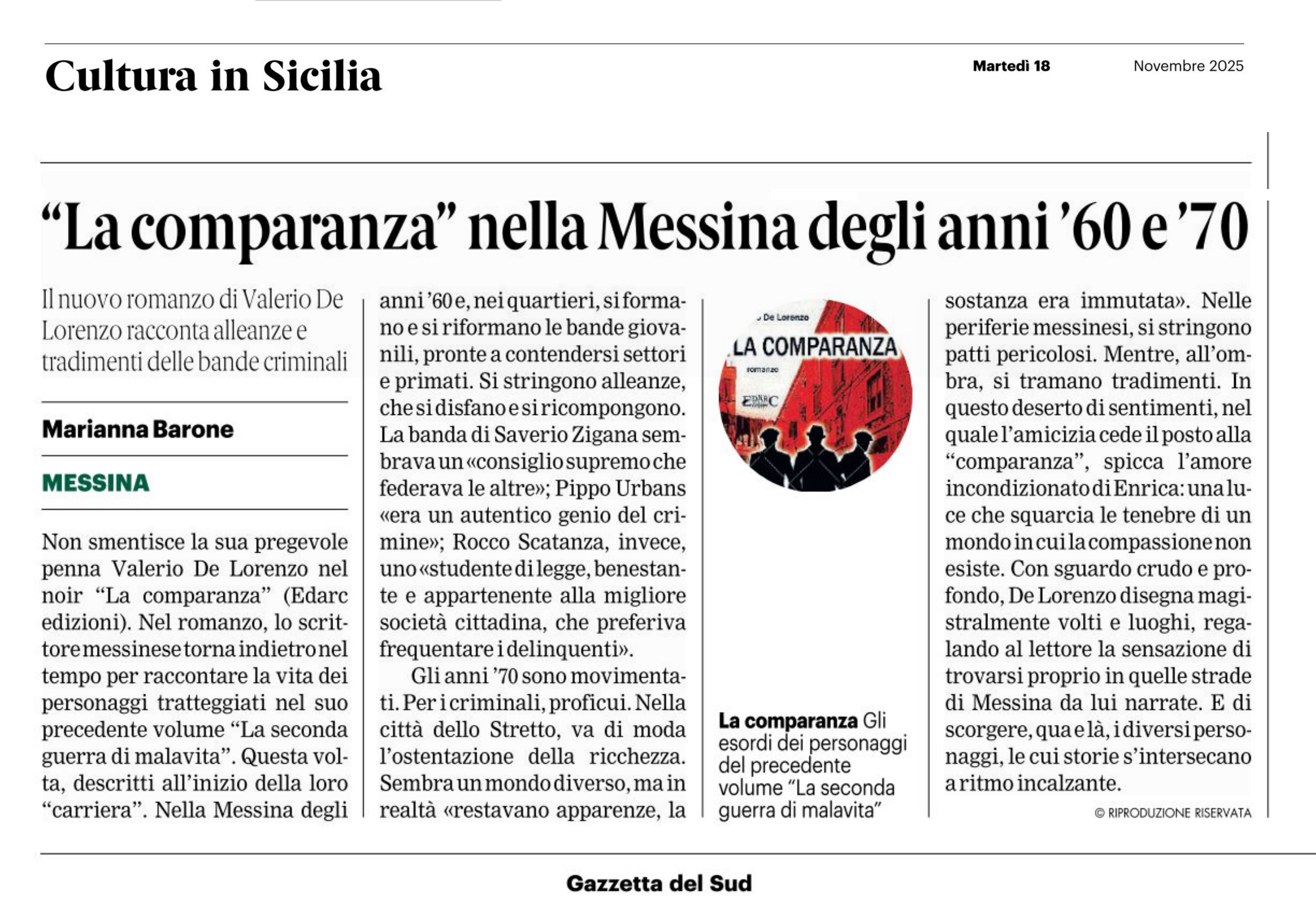 Buongiorno. Ho letto il tuo ultimo libro, "La comparanza". In verità l'ho già finito da tempo perché letto tutto d'un fiato. Devo dire che mi ha appassionato. Ho rivisto la nostra Messina di allora in cui si muovevano i vari personaggi, in parte creati dalla tua fervida fantasia e in parte, secondo me, davvero esistiti ma a cui con maestria sono state cambiate le generalità. (Esisteva davvero un Comandante Cama - navi traghetto). In effetti, tanti fatti mi hanno ricordato quel periodo, altri sono davvero accaduti? Messina veniva considerata, forse a torto, città babba! A parte questi miei interrogativi o riflessioni che questo libro ha avuto il merito di risvegliare in me, ho apprezzato molto come hai saputo descrivere i personaggi e i loro sentimenti, le loro passioni, tanto da riuscire a farmeli immaginare. Che vuoi che ti dica? Grazie per averlo pensato, scritto e donato a tutti noi. Appena possibile comprerò anche gli altri!!